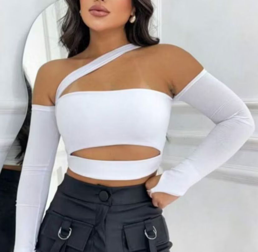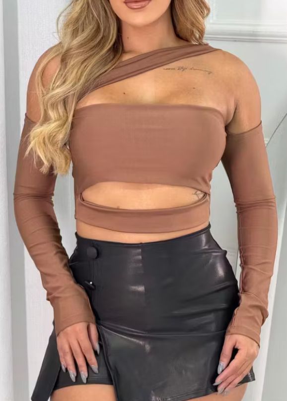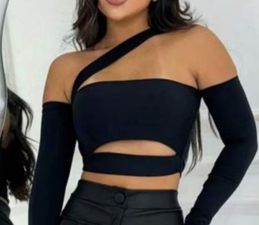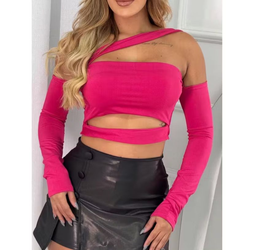 Cropped Faixa Manga Longa Moda Blogueira Gringa Sem Bojo, Decotado Ombro a Ombro